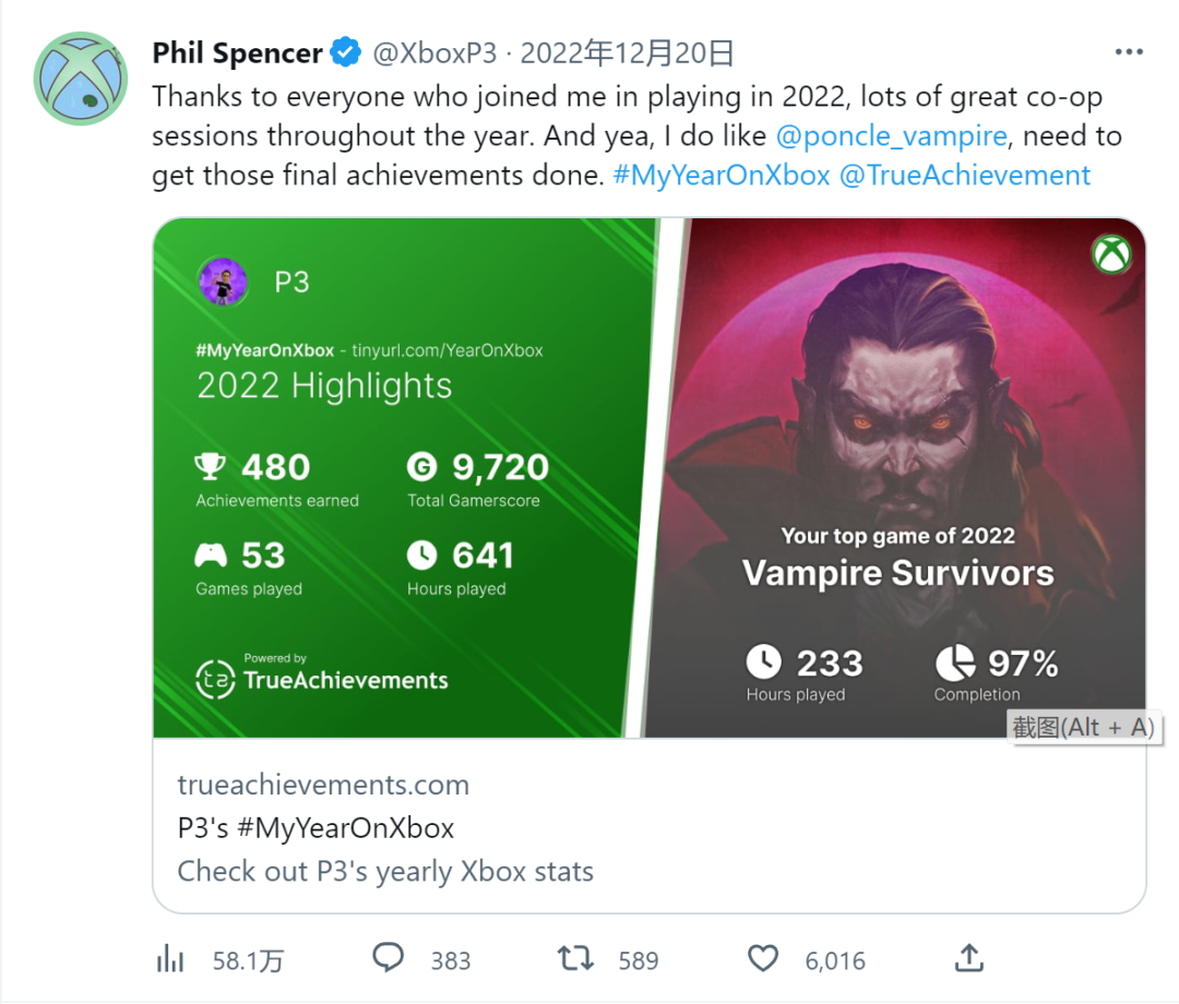 但就是这样简单的内容,吸引了全球无数主播把时间投入其中。微软Xbox负责人菲尔·斯宾塞甚至花了223个小时在这一款游戏身上。根据SteamSpy数据显示,目前《吸血鬼幸存者》的销量已经突破370万套。
