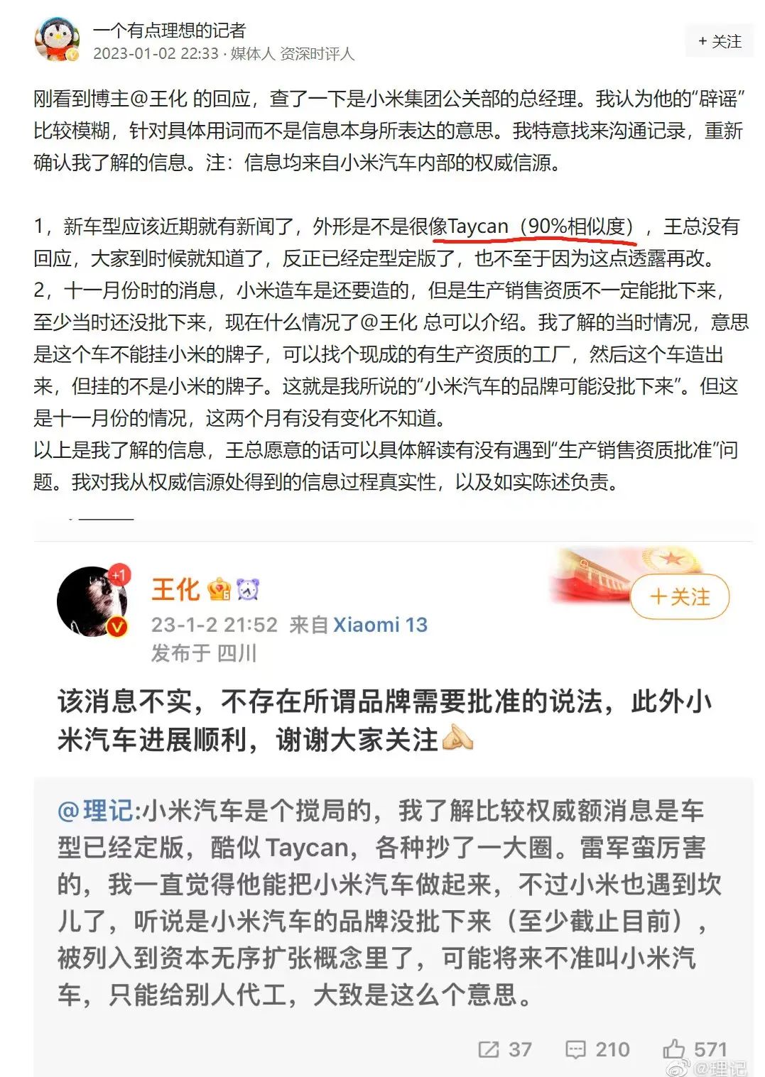 王化回应后,“理记”又发文称,王化的“辟谣”比较模糊,是针对具体用词而不是信息本身所表达的意思,并表示自己的信息均来自小米汽车内部的权威信源。