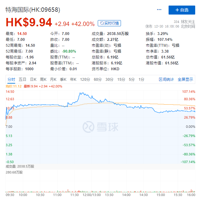 特海国际发行价为7港元每股,盘中一度涨幅超100%,上市当天最终收盘价为9.94港元,较发行价涨了42%,市值为61.56亿港元。上市便迎得开门红,特海国际表现可圈可点。