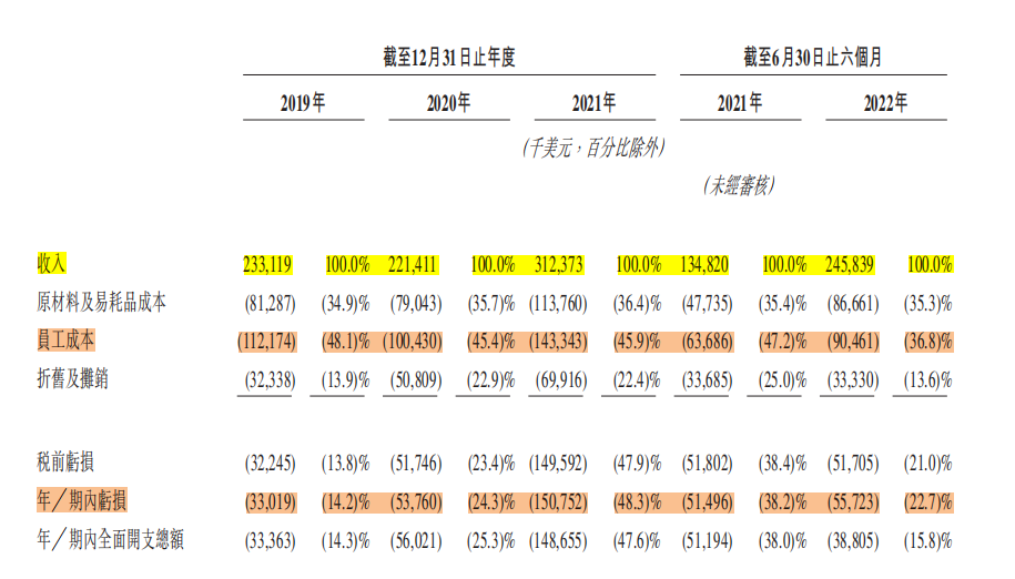 特海国际在2019年到2022年上半年的员工成本分别为1.12亿美元、1亿美元、1.43亿美元和0.9亿美元。对应的营收占比分别为48.1%、45.4%、45.9%、36.8%。