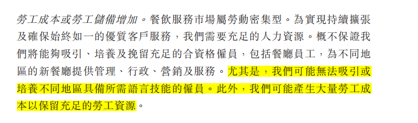 由于餐饮业本身就为劳动密集型行业,以“服务”闻名的海底捞更为依赖人力资源。加之海底捞的海外业务需要拥有多种语言技能的员工,因此员工成本会比国内业务更高。