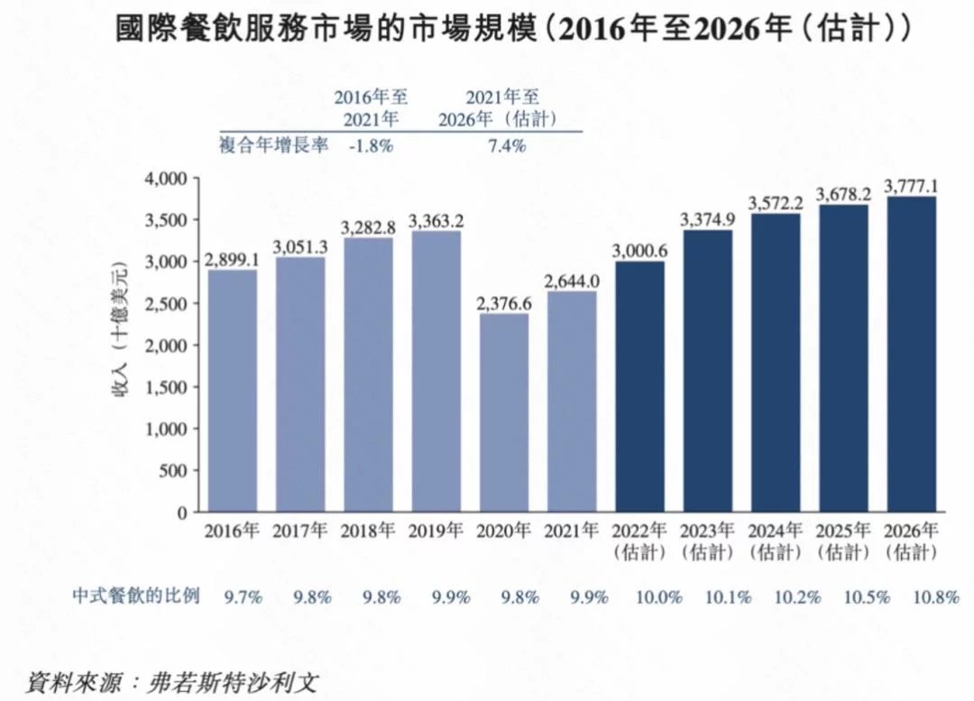 据弗若斯特沙利文报告,国际中式餐饮市场的规模预计从2021年的2611亿美元增长至2026年的4,098亿美元,复合年增长率为9.4%。