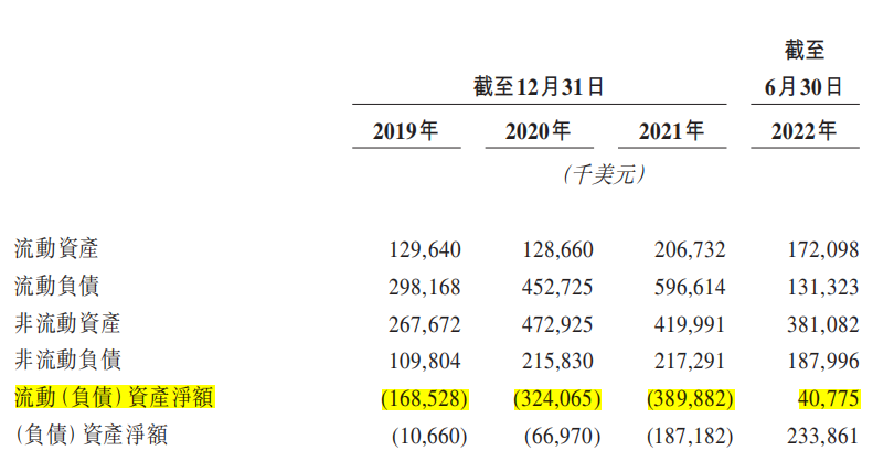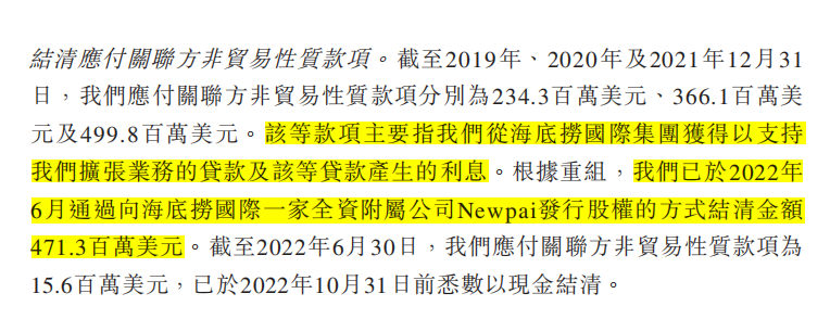 从2019到2021的三年,特海国际的流动负债净额不断扩大,从1.68亿美元增加到3.89亿美元。在流动资产上资不抵债的情况在2022年才得到改善,原因是在重组后,特海国际在2022年6月通过向海底捞国际的全资附属公司newpai发行股权的方式结清贷款债务。