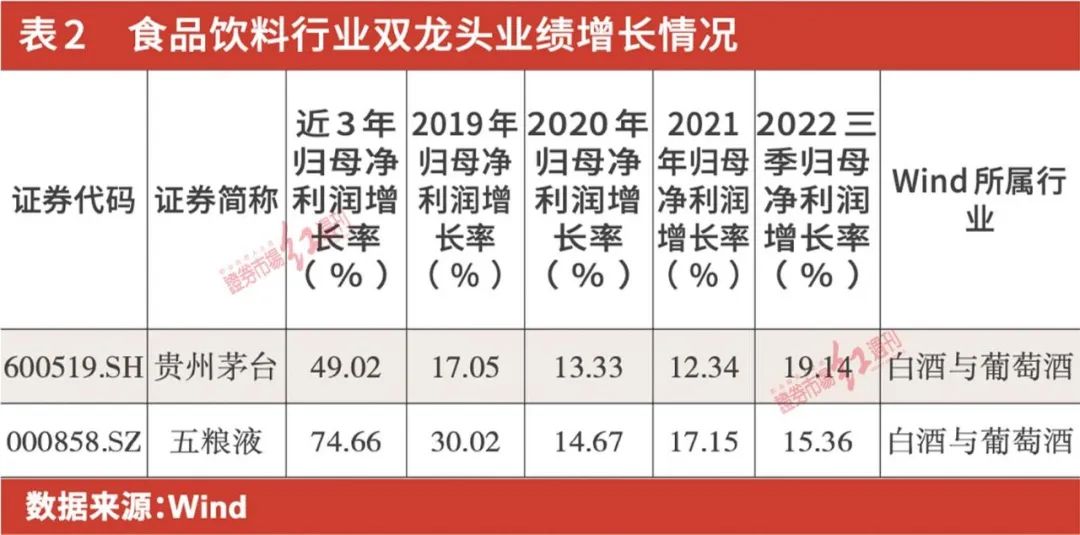 实际上,食品饮料行业已经形成贵州茅台和五粮液双龙头格局。以2022年三季报归母净利润情况看,贵州茅台一家的归母净利润就占了全行业的三分之一,而最新的年报预告显示,其预计实现归属于上市公司股东的净利润达626亿元左右,同比增长19.33%左右。而且,即便是有三年疫情扰动,这两家公司业绩增长仍维持在双位数(见表2)。