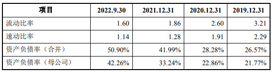根据宇晶股份披露的主要财务数据,2019年以来,资产负债率(合并)从26.57%持续上升至2022年9月30日的50.90%,各期末的负债总额分别为2.84亿元、3.10亿元、5.65亿元和9.25亿元,负债压力在增加;流动比率、速动比率则出现相反的变化趋势,均呈现为逐年下降。