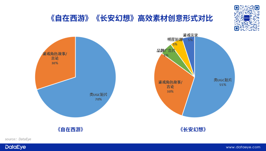 《自在西游》投放量多,但高效素材创意形式层面上侧重于通过类UGC短片/类原生视频(口播)的形式展现内容素材。相比之下,《长安幻想》在创意形式层面上更加多元,除了UGC短片之外,还有代言人宋轶相关的真人短剧和品牌广告片,使得创意素材内容上整体变化更多、元素更多。