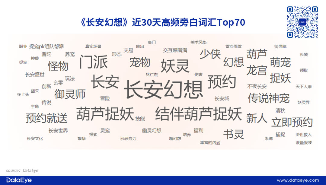 相比之下,近30天内《长安幻想》的高频旁白词汇则以“东方幻想”元素为主,例如“捉妖”“妖灵”“葫芦”等等。旁白词汇符合《长安幻想》“灵妖国风长安”的主基调内容,通过东方幻想、妖灵宠物关键词来吸引玩家,期望打当下宠物热这个点。