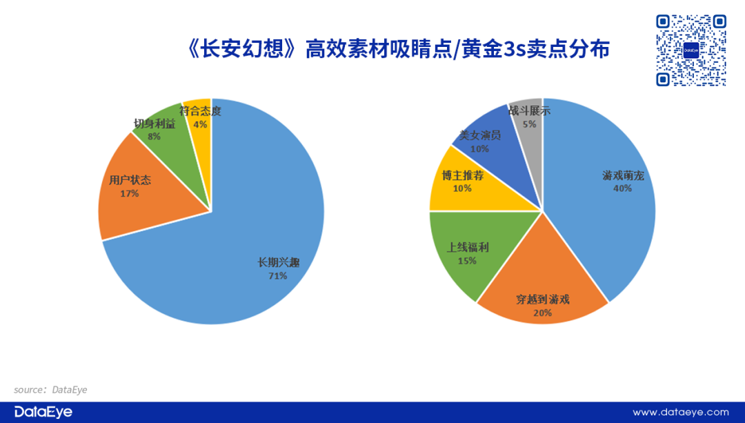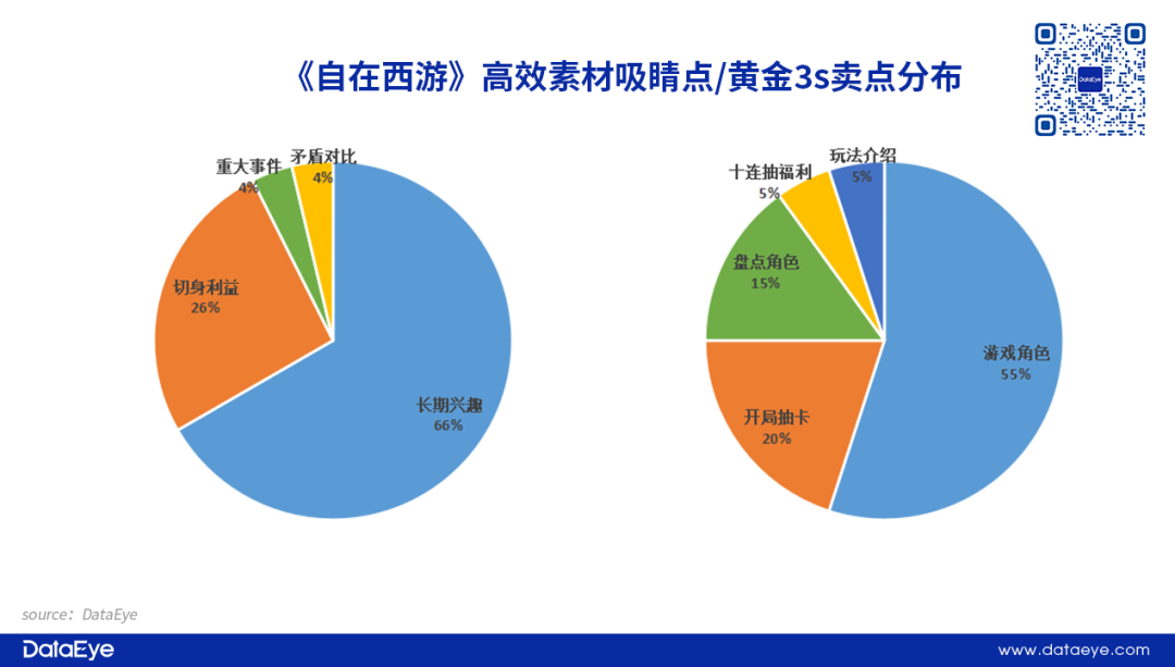 从素材内容层面来看:提炼产品特点,形成差异。《自在西游》《长安幻想》并不是玩法创新的产品,因此项目组重点提炼出产品的特点,突出差异化:《自在西游》主打国漫表现+西游IP,从精致的国风唐彩入手,强调产品的独特性,另外加上“终身送10连抽”的玩家利益,形成营销组合拳。