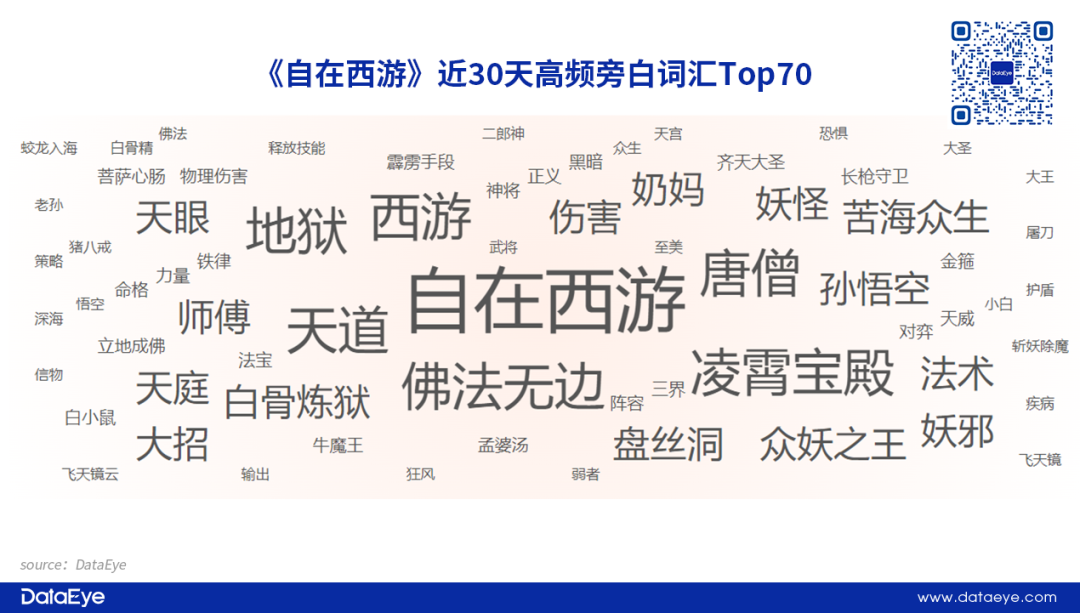 DataEye-Tidea素材创意分析指出,近30天内《自在西游》高频旁白词汇以“西游IP”为主,例如“佛法无边”“凌霄宝殿”“唐僧”“孙悟空”等等,项目组以通过耳熟能详的经典词汇,希望吸引到对西游IP感兴趣的潜在用户。