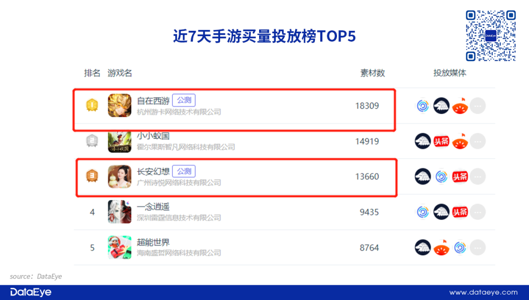 值得注意的是,根据DataEye-ADX投放数据显示,这两款产品在近7天素材投放表现凶猛!《自在西游》锁定中重度周素材榜一位置,而《长安幻想》紧随其后,排名第三!