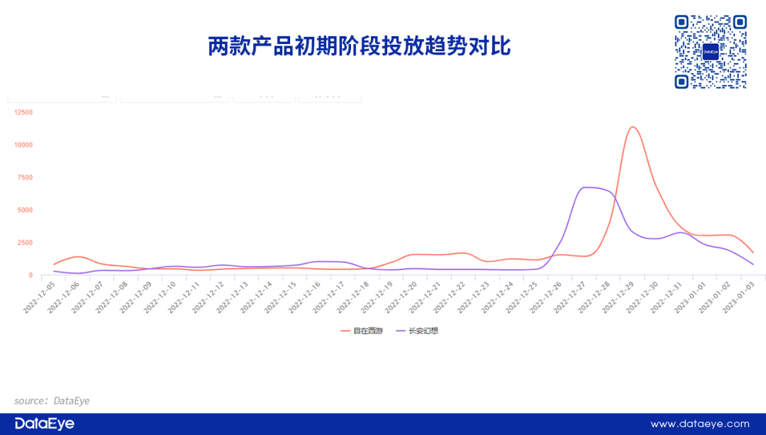 而在产品上线当天,投放量力度再度提升。《长安幻想》上线当天单日投放超过6700余组素材,而《自在西游》上线当天素材投放量更是超过万组。