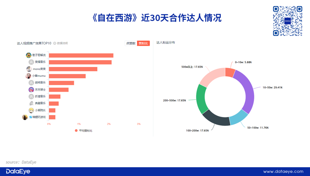 DataEye研究院认为,《自在西游》项目组通过星图自行寻找达人是希望找到与产品契合度更高的达人,进而形成相对精准的营销。同时也能把握好达人营销内容,避免偏离营销核心主张的内容出现。可是由于沟通、规划、审核成本较高,内容数量较少,以至于在传播方面低于发行人计划。