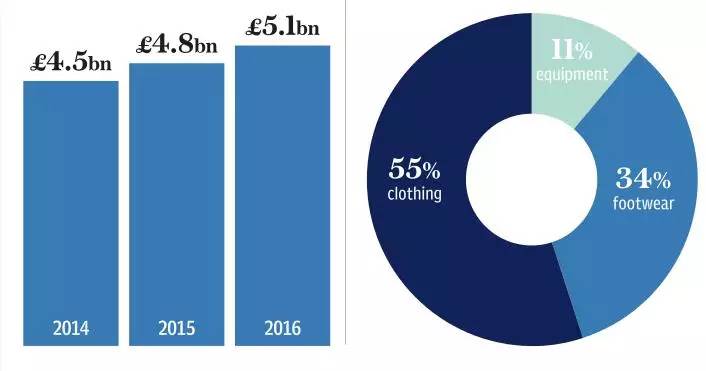 左:英国运动休闲市场消费变化(单位:十亿英镑)右:英国运动休闲市场消费分布比例,分别为服装55%,鞋类34%,设备11%。