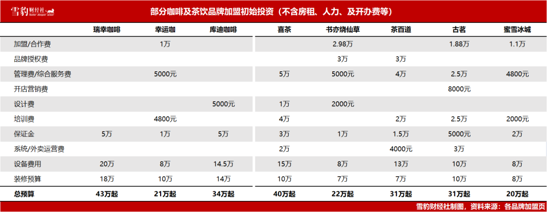 雪豹财经社对比发现,和奶茶品牌相比,瑞幸的初始投入主要贵在装修和设备费用。三四线城市奶茶店的面积通常是二三十平方米,装修成本1500元/平米,远低于瑞幸的18万元。设备方面,咖啡店的成本是连锁奶茶品牌的2~3倍。