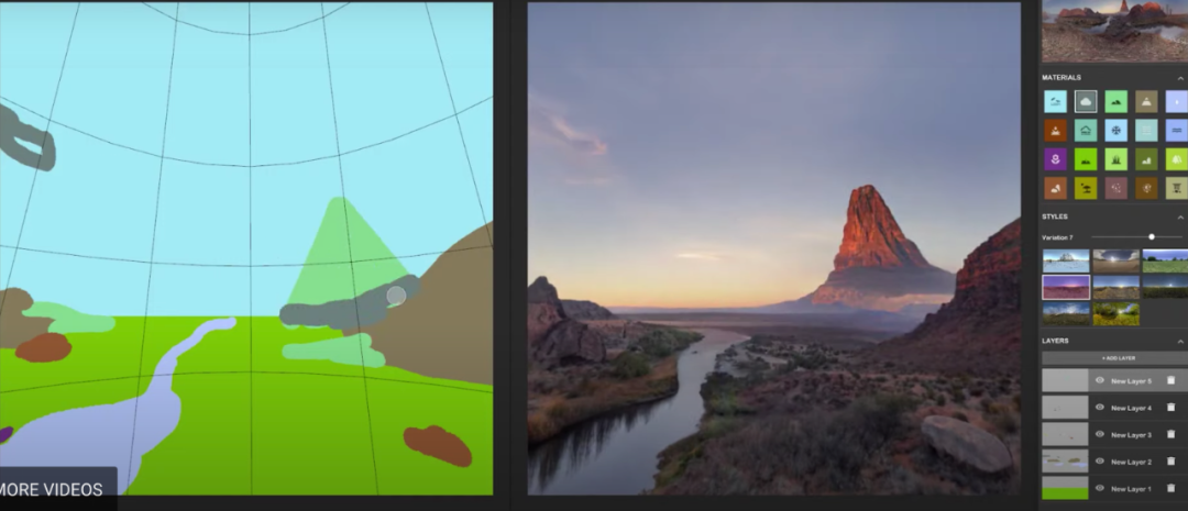 NVIDIA Canvas可以让艺术家无缝地生成背景。在AI加持下,只需要通过简单的笔触对背景进行排布就能自动生成精细的背景。