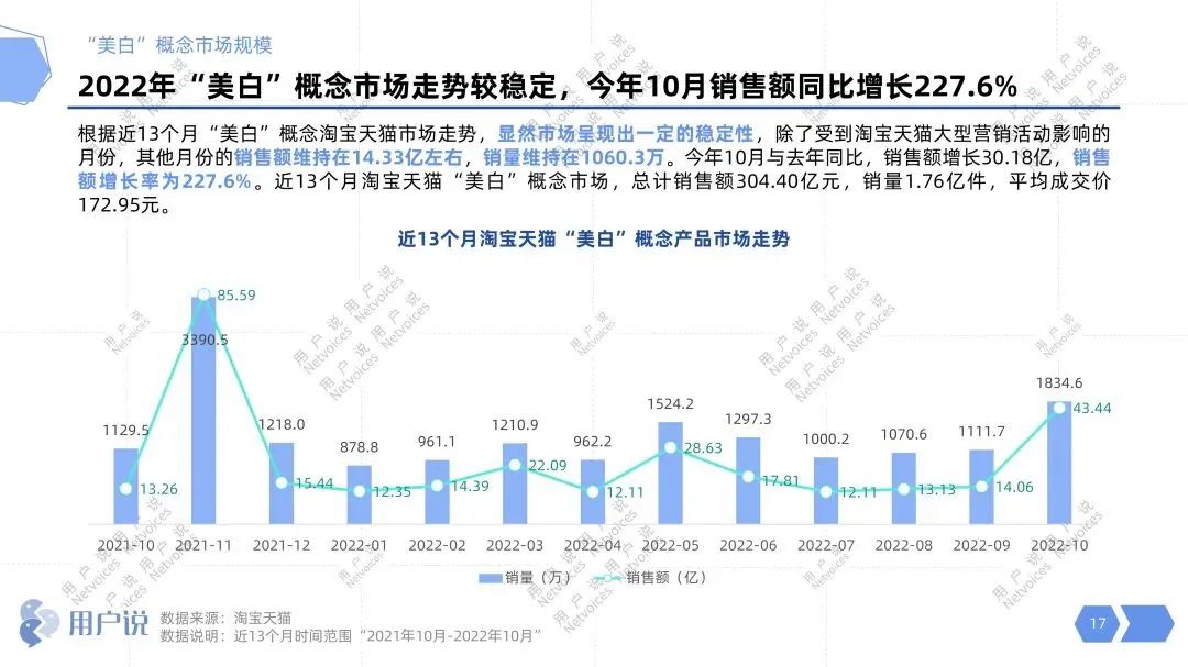 近日,用户说发布的《2022“美白”概念线上消费趋势洞察》显示,近13个月以来,仅淘宝天猫平台卖出的美白单品高达1.76亿件,实现了304.4亿元的业绩。其中2022年10月销售额同比去年更是大涨超227.6%,我国美白市场发展潜力巨大。