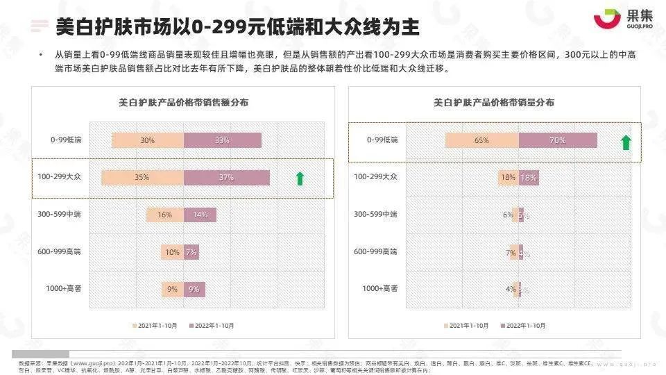 从价位上来看,目前美白淡斑市场上中低端产品仍为主流,其中0-99元低端线商品销量表现较佳且增幅也亮眼,100-299元的大众市场是消费者集中购买的价格区间。