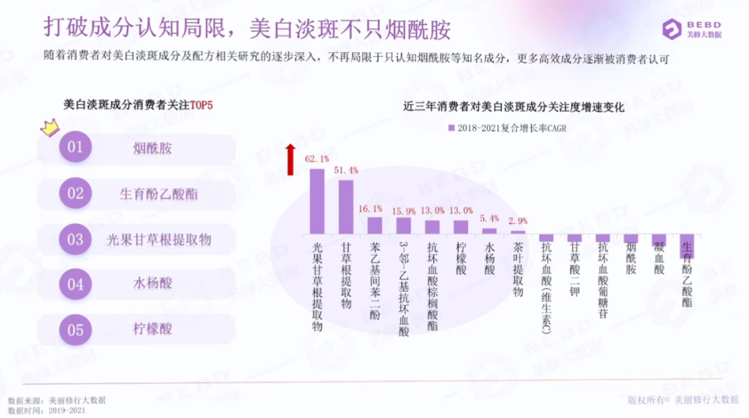 根据美丽修行发布的美白淡斑成分消费者关注TOP5,分别为:烟酰胺、生育酚乙酸酯、光果甘草根提取物、水杨酸和柠檬酸。