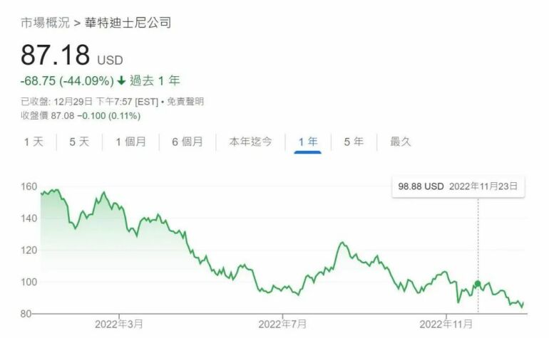 第二天,迪士尼股价跌幅创下历史之最。在过去20个月的时间里,股价从每股201.91美元跌至86.75美元。