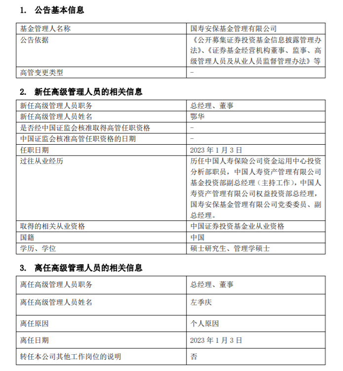 新年伊始,又有公募管理人的高管发生了变更。 1月4日,国寿安保基金发布高级管理人员变更公告,自1月3日起,左季庆离任国寿安保基金总经理、董事职务,由鄂华任公司总经理、董事。