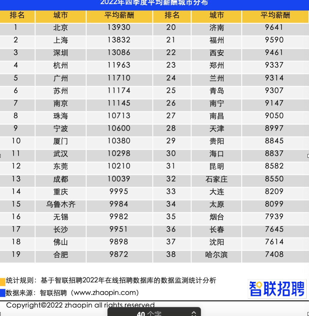 从全国范围来看,在智联招聘监测的全国38个核心城市中,四季度北上深广杭薪酬水平仍领跑。