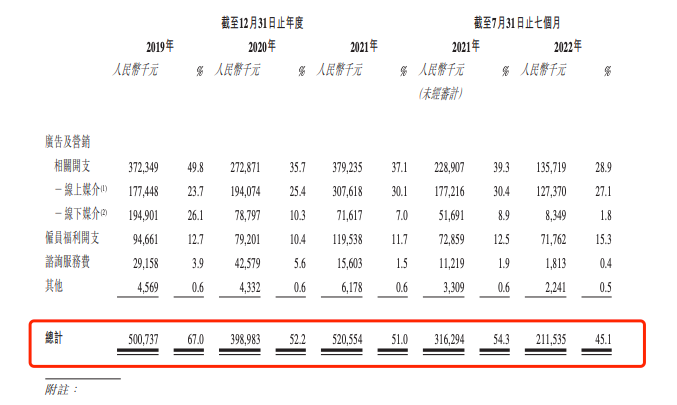 大麦植发钱都去哪里了?根据招股书,报告期内大麦植发的营销开支分别为5亿元、3.99亿元、5.21亿元以及2.12亿元,三年多合计16.3亿元,占营收的比例分别为67%、52%、50%以及45%,近一半的收入用于营销。