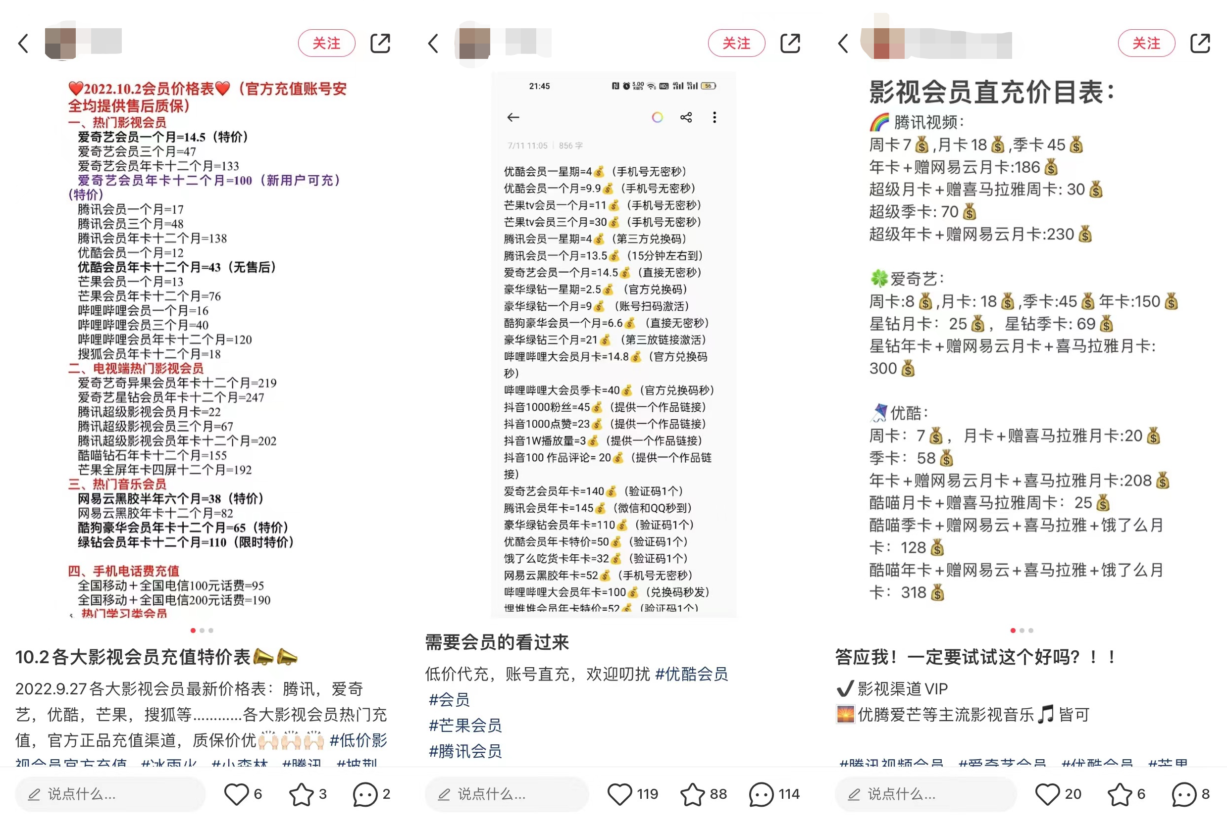长视频付费市场早已进入亿级会员时代,这一庞大的市场,也被无孔不入的黑灰产业链盯上。很多有组织的个人、团伙通过群控手机等手段注册账号,批量购买会员。在互联网平台,搜索“视频会员”,即可看到爱优腾芒B的会员倒卖信息,从日租到年卡,从整租到拆卖一应俱全,不法团队也因此牟取了高额利益。