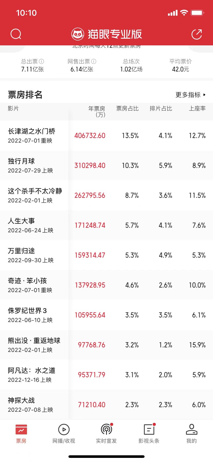 过去一年间,头部影片和中腰部影片均急剧减少,全年共有7部影片票房突破10亿,在2019年,这个数字是15部。拓普数据显示,票房2-5亿新片仅7部,较2021年大幅减少11部,票房份额仅占全年大盘的8.9%。