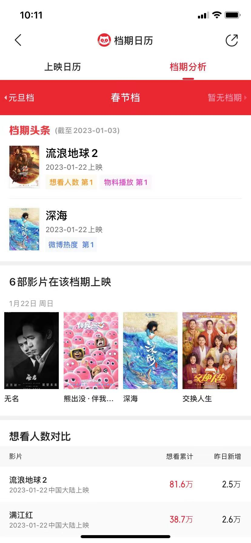 截至今日,春节档已经定档六部影片,包括雷佳音张小斐主演的合家欢喜剧《交换人生》,郭帆导演、吴京刘德华李雪健主演的《流浪地球2》,张艺谋导演、沈腾易烊千玺张译主演的《满江红》,程耳导演、梁朝伟、王一博等主演的《无名》,以及《大圣归来》导演田晓鹏七年磨一剑的国漫动画《深海》,系列IP《熊出没·伴我“熊芯”》。可以预见的是,在“最强春节档”呼声的同时,可能又将迎来“最贵春节档”。春节档能够帮助过去一年里失血过多的行业回血吗?