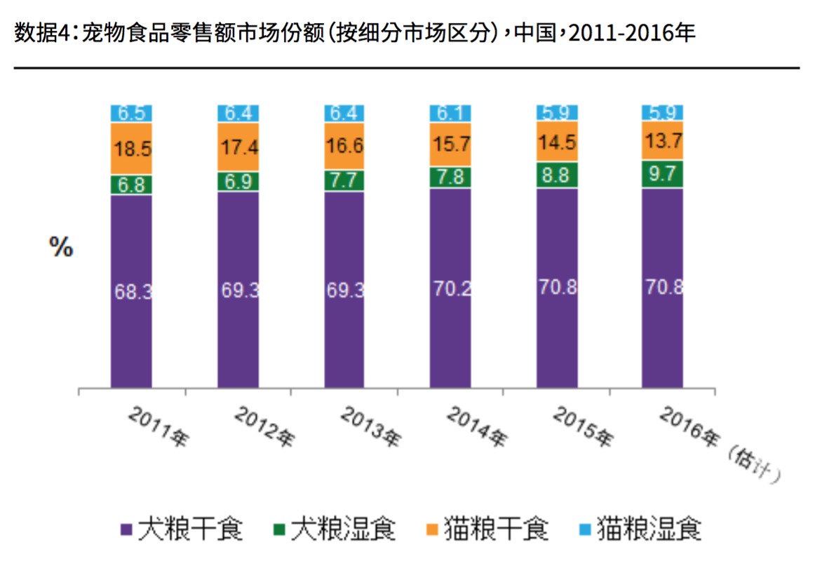1.狗是在中国最受欢迎的宠物,2016年犬粮在猫狗类宠物食品零售市场的占比超过80%。