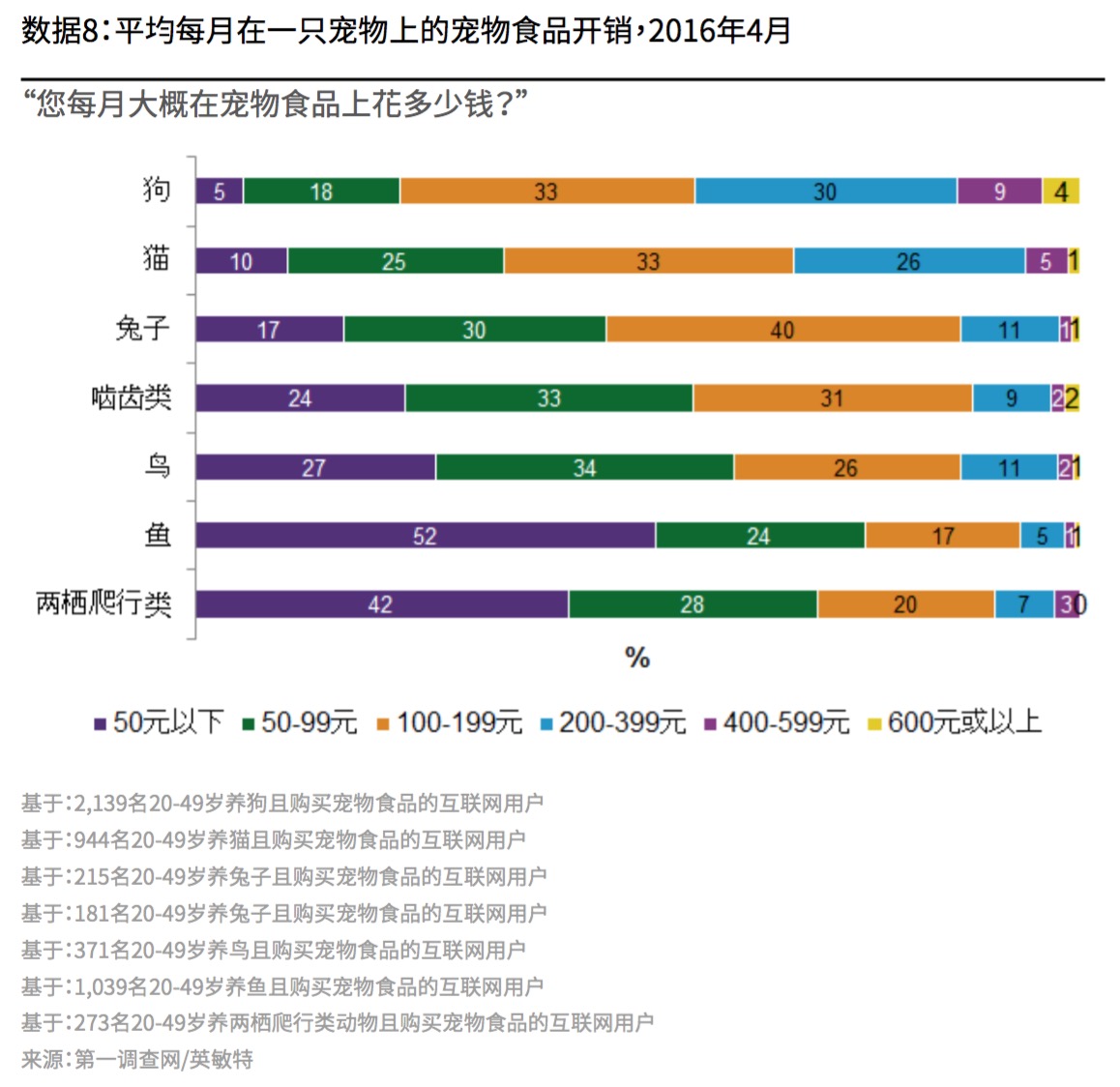 而饲养其他动物的消费者(啮齿类、鸟、鱼和两栖爬行类)大部份已以喂食宠物食品为主。其中,基于兔子天生的饮食习惯,兔子则主要被喂食一般食品。