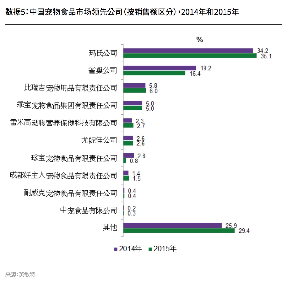 宠物食品业务已进入中国市场20多年的玛氏公司目前市占率排名第一。2014年4月,宝洁公司将所有宠物品牌(Iams、Eukanuba和Natura)出售给玛氏,收购完成后,玛氏集团旗下拥有11个宠物用品品牌。由于消费者通常并不知晓不同品牌背后的生产商,且消费者品牌重视度较低,因此多样化的品牌线为玛氏集团带来了更多收益。