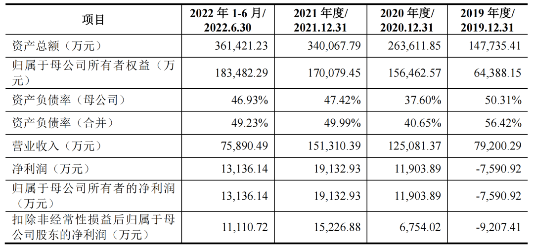 从财务数据来看,根据招股书显示,2019年、2020年、2021年及2022年1月至6月公司营业收入分别为79,200.29万元、125,081.37万元、151,310.39万元和 75,890.49万元,扣除非经常性损益后的归属于母公司股东的净利润分别为-9,207.41万元、6,754.02万元、15,226.88万元和 11,110.72万元。