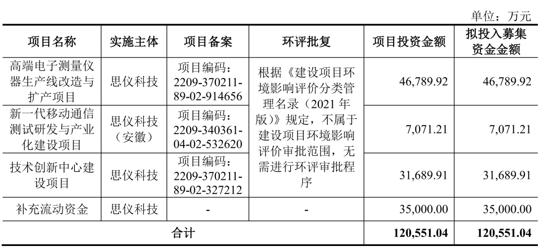 思仪科技本次IPO拟募集资金12.06亿元,用于高端电子测量仪器生产线改造与扩产项目、新一代移动通信测试研发与产业化建设项目、技术创新中心建设项目及补充流动资金等。