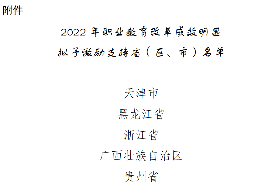 教育部网站1月5日消息,教育部职业教育与成人教育司表示,根据《职业教育改革成效明显的省(区、市)激励措施实施办法》,遴选了2022年职业教育改革成效明显、拟予激励支持省(区、市),现予以公示。公示时间为2023年1月5日-11日。