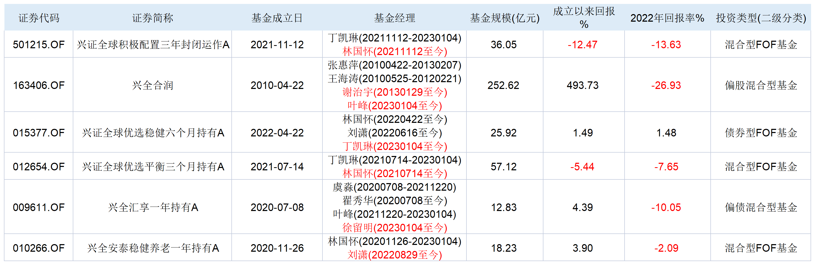 除了兴全合润混合发生基金经理变动外,1月4日,兴证全球基金还公告称,兴全优选进取三个月持有混合FOF、兴证全球优选稳健六个月持有债券FOF、兴全安泰稳健养老一年持有混合FOF、兴证全球积极配置三年封闭混合FOF-LOF、兴证全球优选平衡三个月持有混合FOF等5只FOF发生基金经理变动。