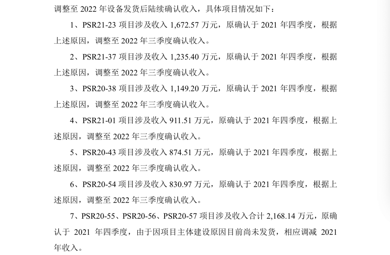 公告显示,该会计差错更正根据公司的解释是项目存在因客户或业主原因确认验收并要求公司推迟发货的情况,公司对涉及上述情况的项目统一进行调整,界面新闻注意到,其中2021年第四季度近6674.13万元的收入都调整至2022年第三季度确认。