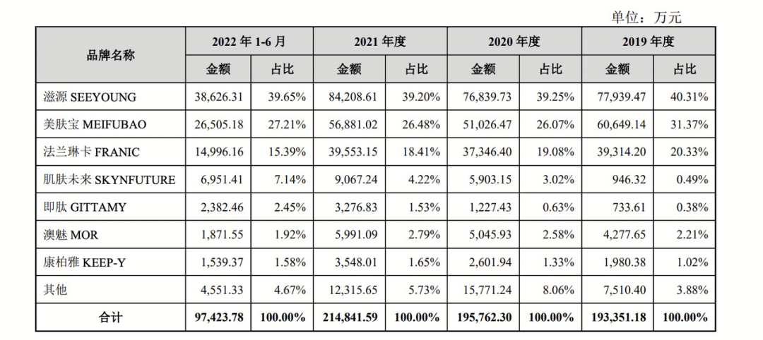 2019年至2022上半年,公司的总营收分别为19.4亿元、19.8亿元、21.6亿元、9.9亿元,收入增速分别为2%、9%、-8.5%,而同行业的贝泰妮、珀莱雅、水羊股份的收入增速保持在20%-30%甚至更高。值得注意的是,公司的主要品牌滋源和法兰琳卡在2020年时受到疫情影响而营收下降;美肤宝同样在2020年收入下降,且该品牌虽然在2021年实现收入同比增长,但该年的收入依然不及2019年。