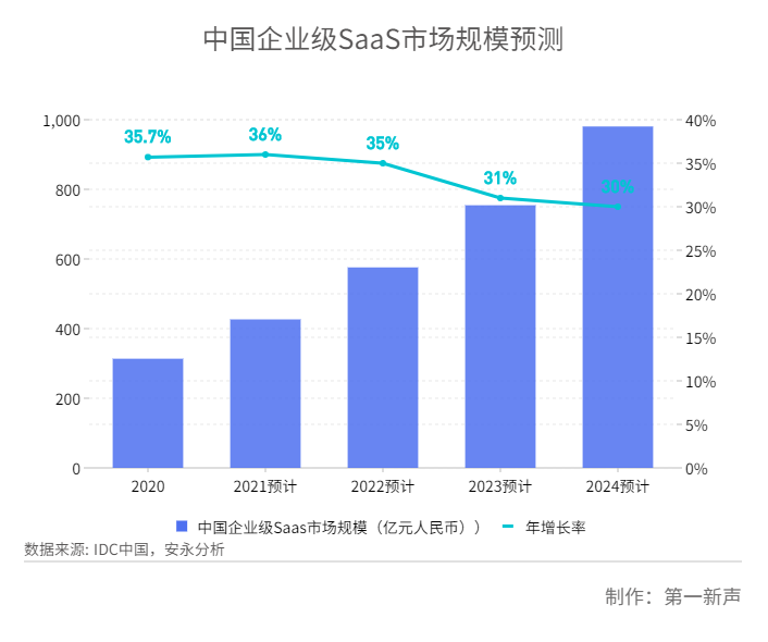 结合IDC公布的数据,安永预计到2024年,中国SaaS市场发展仍然处于起飞阶段,年增速不低于30%,但增速渐缓,市场将逐渐趋于成熟。
