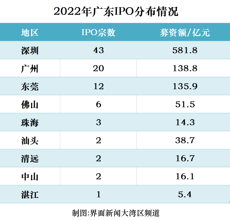 目前,深圳是挑起广东IPO大梁的主力军,贡献了超过47%的IPO和近60%的募集资金。2022年深圳IPO宗数达到43个,募集资金达581.8亿元。