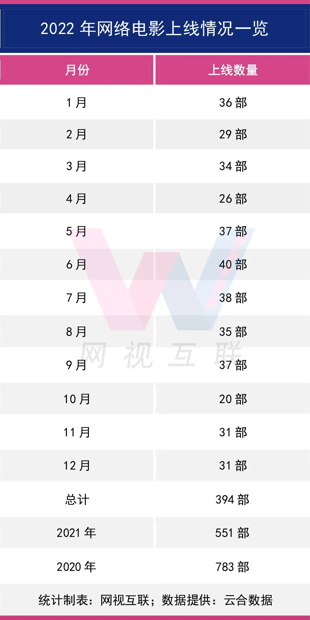 据云合数据提供给网视互联的独家数据显示,2022年各视频平台上线网络电影共394部。上新数量进一步缩减,较2021年减少了157部。
