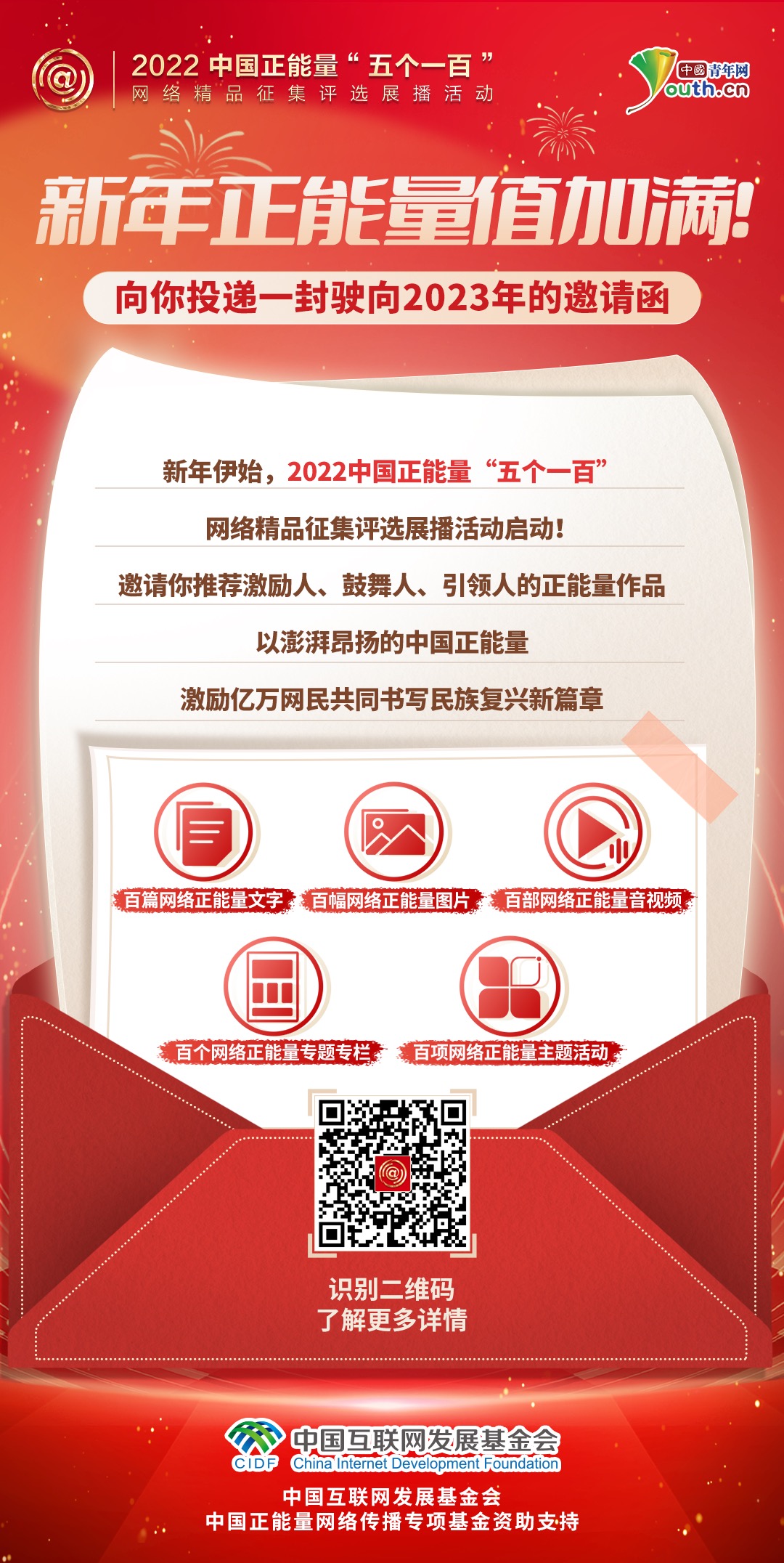 2022中国正能量“五个一百”网络精品征集评选展播活动已启动,活动以“团结奋进新征程 同心奋斗创伟业”为主题。