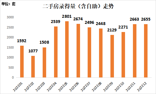 随着新版网签系统的上线,深圳新的二手房交易监管规则要求中介行业必须发布“三码”俱全的真房源,年初各机构都在清查和完善原平台内的房源信息,故当时市场二手房挂牌量非常少,但随着各家机构整改完毕,房源挂牌量呈现持续上升态势。随着年末市场翘尾行情的出现,业主心态发生变化,有“捂盘惜售”现象,同时叠加疫情防控政策优化后短期内的疫情快速爆发,市场二手房挂牌量出现一定下滑。