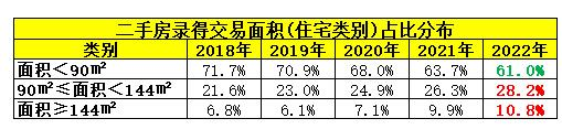 除了板块热度发生了较大变化外,近年来二手房交易面积也发生了较明显变化,即刚需型户型的录得占比持续走低,而刚改户型以及豪宅户型的录得占比则持续走高(如下图),究其原因,还是在于刚需即首次置业群体相比改善型群体对调控政策以及经济下行的抗冲击能力较弱,导致购房意愿持续下降,也从侧面解释了,在当前刚需主力军仍处于持续观望与徘徊的阶段,月均二手房交易单靠改善型群体是难以突破三千套“天花板”的。