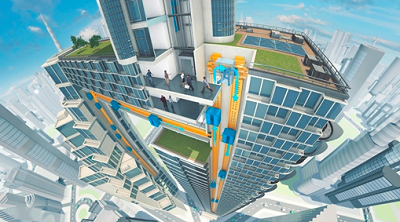 他还表示,传统电梯一般是用缆绳来拉动,立体电梯由于使用了MULTI系统技术,通过计算机算法控制多台轿厢,从而使多个轿厢能够在一个井道内安全上行,在另一个井道内安全下行,形成一个连续的环路,实现了到无缆电梯的转变,同时提高了井道的运输能力。