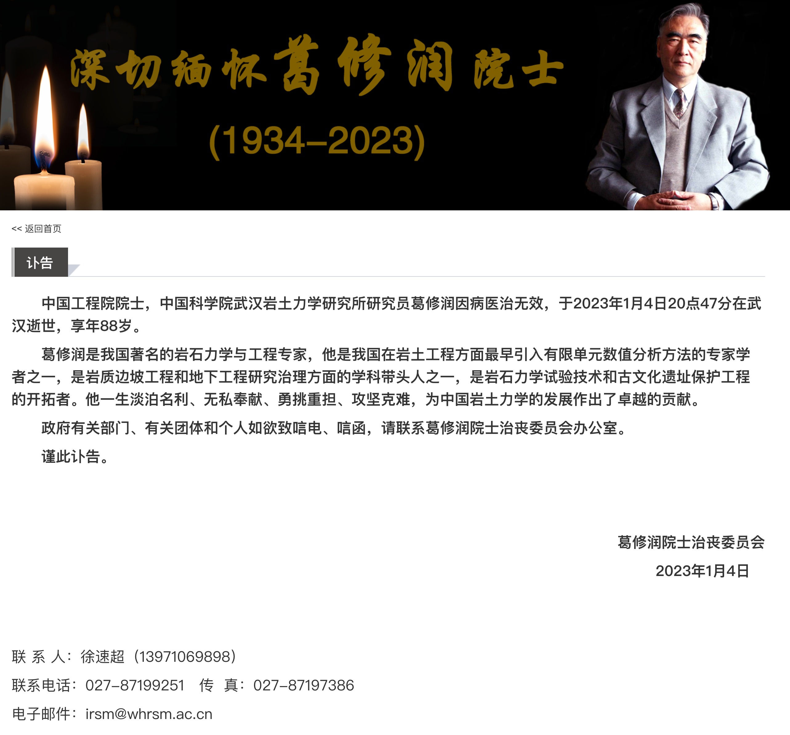 中国科学院武汉岩土力学研究所1月5日发布讣告,中国工程院院士,中国科学院武汉岩土力学研究所研究员葛修润因病医治无效,于2023年1月4日20点47分在武汉逝世,享年88岁。