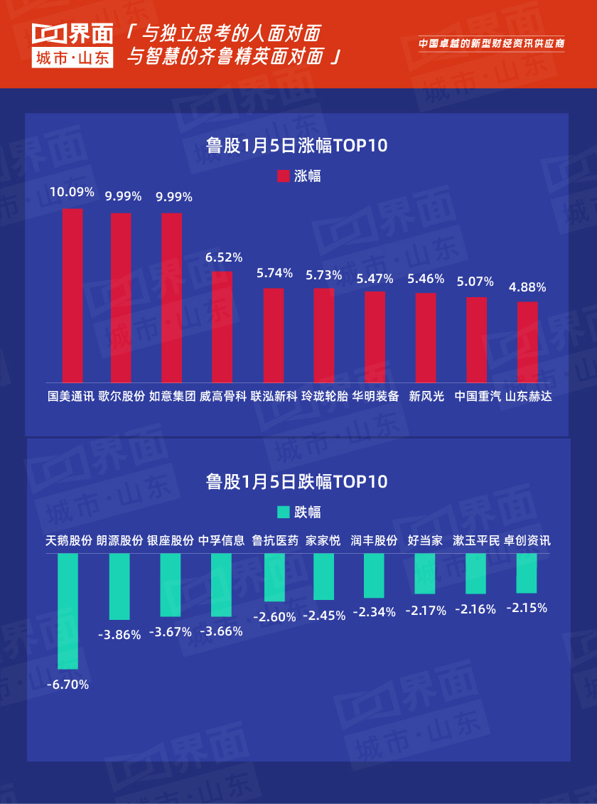 1月5日,山东省内沪深京股票有163只个股上涨,110只个股下跌;总市值过千亿的有万华化学(600309)、海尔智家(600690)、 兖矿能源(600188)、青岛啤酒(600600)、中航沈飞(600760)共5家,500亿-1000亿的共有6家,分别是潍柴动力(000338)、山东黄金(600547)、华鲁恒升(600426)、华熙生物(688363)、歌尔股份(002241)、华电国际(600027)。