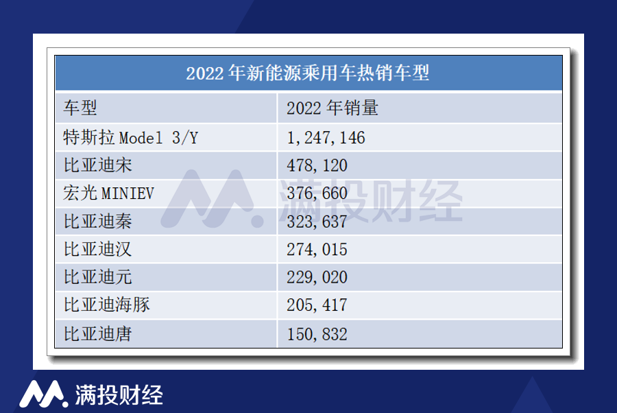 从车型来看,特斯拉的Model 3和Model Y交付量合计超过120万辆,成为全球多个国家的畅销车型,继续蝉联全球纯电动车销量冠军,在国内同样也是销量大户。五菱宏光MINI的表现依旧突出,年销量为37.66万辆,在低价位的车型中成为大多数用户的选择。而比亚迪的多款车型都成为2022年新能源乘用车的热销车型,其中比亚迪宋的年销量高达47.8万辆,比亚迪秦的年销量高达32.36万辆;比亚迪汉、比亚迪元、海豚的年销售量在20万以上。比亚迪生产纯电动车和插混这两种新能源车,纯电动车的销量低于特斯拉,但是如果两者销量叠加,将超过特斯拉。
