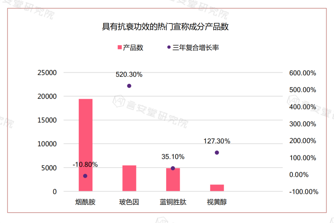如今的A醇、玻色因和多肽在抗衰领域中几乎三分天下。2019年前后,在欧莱雅的玻色因专利松动时,国内市场迅速迎来了一波热潮,功效品牌们竞相下场——根据言安堂研究院的数据,2019年至2021年,宣称玻色因成分的产品数量3年复合增长率高达520.3%。