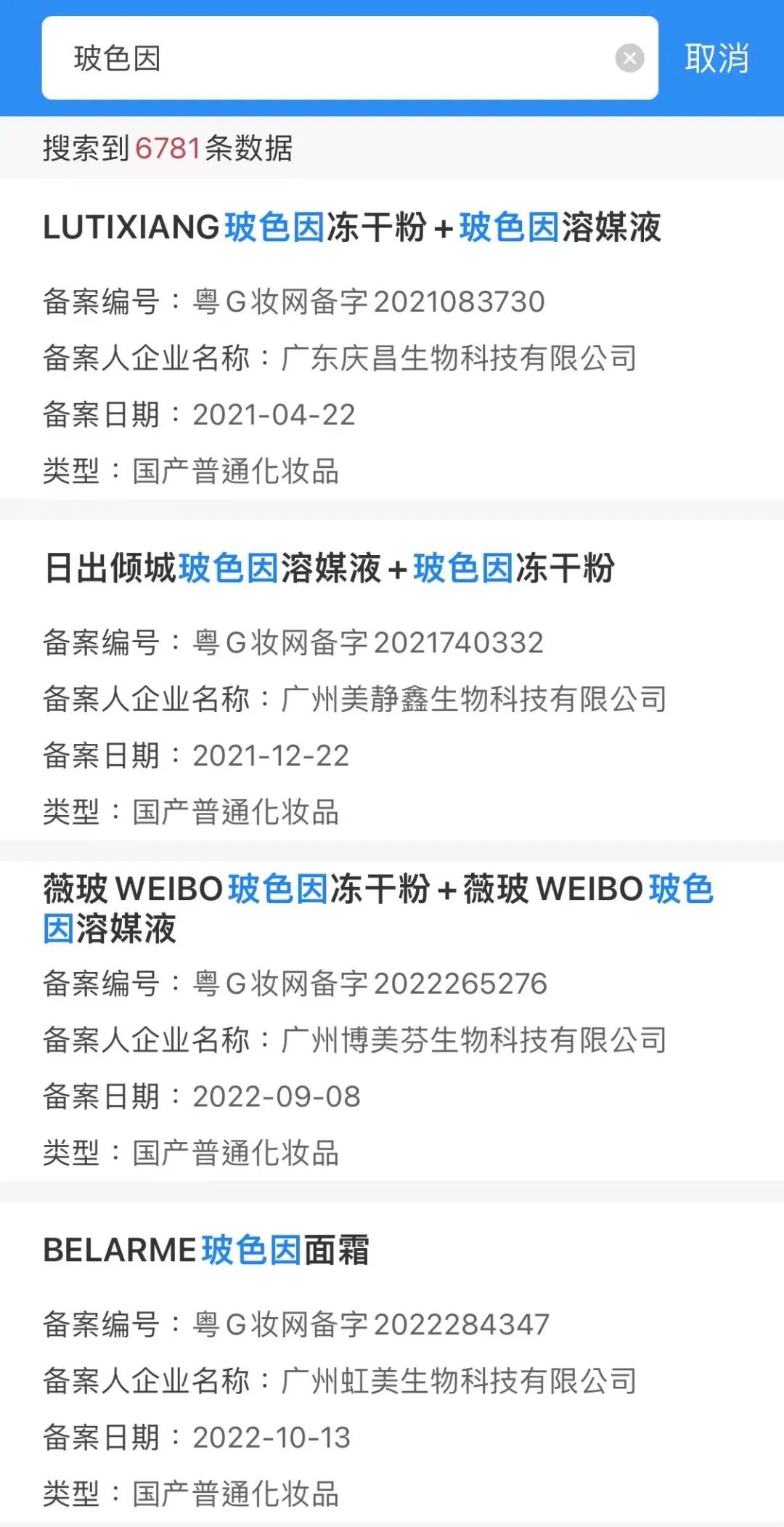 春雷社查询国家药监局相关信息发现,当前包含「玻色因」的产品备案已经高达 6781条——